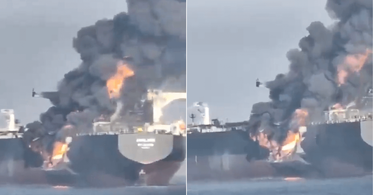 A footage captured the terrifying moment two large tankers collided and burst into flames in the Gulf of Oman early Tuesday morning.
