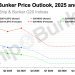 Ship & Bunker‘s latest global average bunker price forecast shows VLSFO averaging about $493/mt in Q4 2025, before dropping to $413/mt in Q1 and to $411/mt in Q2. 2026 as a whole will see an average price of $414/mt.
