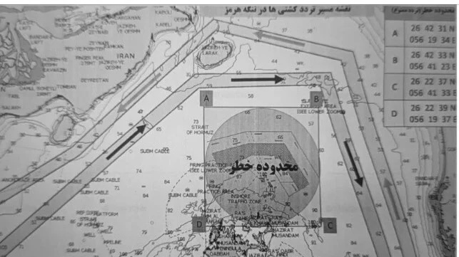 Against this volatile backdrop, Iran’s Ports and Maritime Organization issued a redrawn traffic separation scheme (pictured) for the strait, citing the risk of anti-ship mines in the main traffic zone. The new routing directs inbound vessels through a northern corridor between the islands of Qeshm and Larak under IRGC supervision – while outbound traffic is funnelled via a southern path past Larak and within easy reach for Iranian naval escorts. A designated “danger zone” marked “transit prohibited” now encompasses the IMO-designated traffic separation scheme off the Musandam Peninsula, and the new chart appears to conflict with the recently-launched Omani-administered shipping lane at the strait’s southern edge.