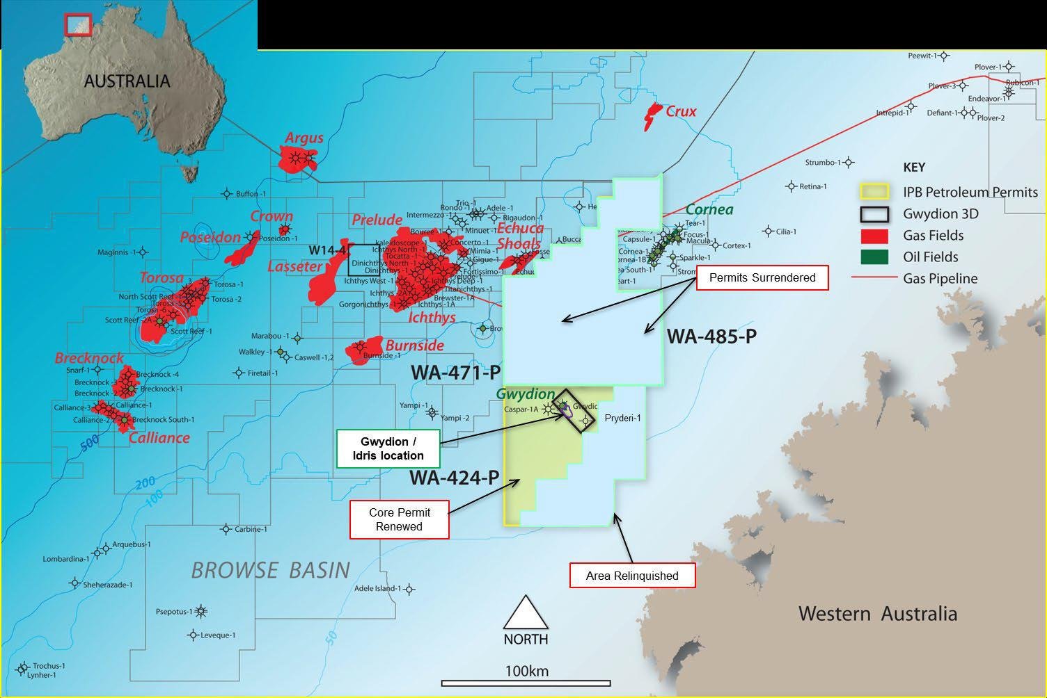 The Browse Basin is located north of Broome, offshore Western Australia, and covers an area of approximately 140,000 square kilometers. IPB’s 100%-owned WA-424-P permit contains three wells: Gwydion-1, Caspar-1A, and Pryderi-1. The first one was drilled by BHP Petroleum, now BHP Billiton Petroleum, in 1995.