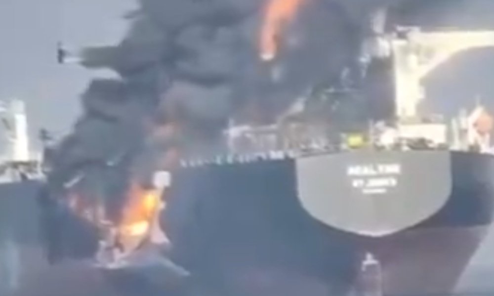 Two tankers suffered a fiery collision south of the Strait of Hormuz in June (pictured above) following extensive GPS spoofing, while the 7,000 teu MSC Antonia ran aground off Jeddah in May as a result of GPS spoofing, the ship subsequently appearing on various vessel tracking services hard aground in the desert on another continent (pictured below).