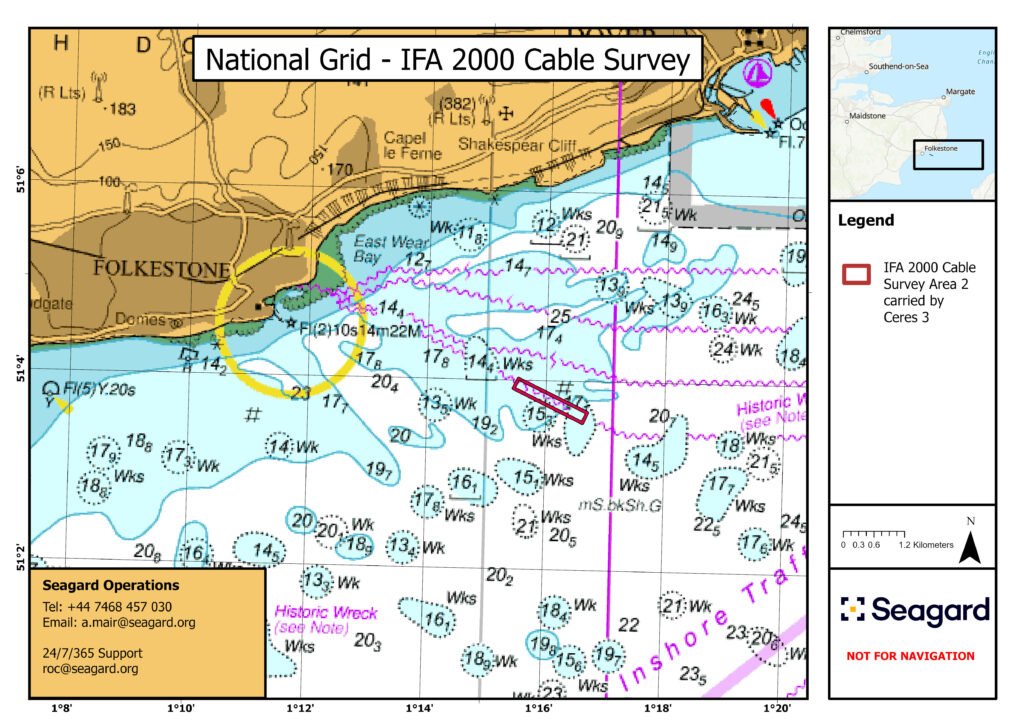 The survey of the IFA 2000 submarine cable is scheduled to begin today, November 5, approximately 3 nautical miles offshore Folkestone, Kent, and will continue until November 9 or 10, subject to weather and operational conditions.