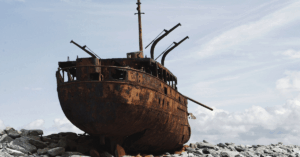 The hull struck a rock, tilted, and rolled over onto its side before sinking. Over the centuries, shifting waters caused the wreck to reappear in the desert sands.