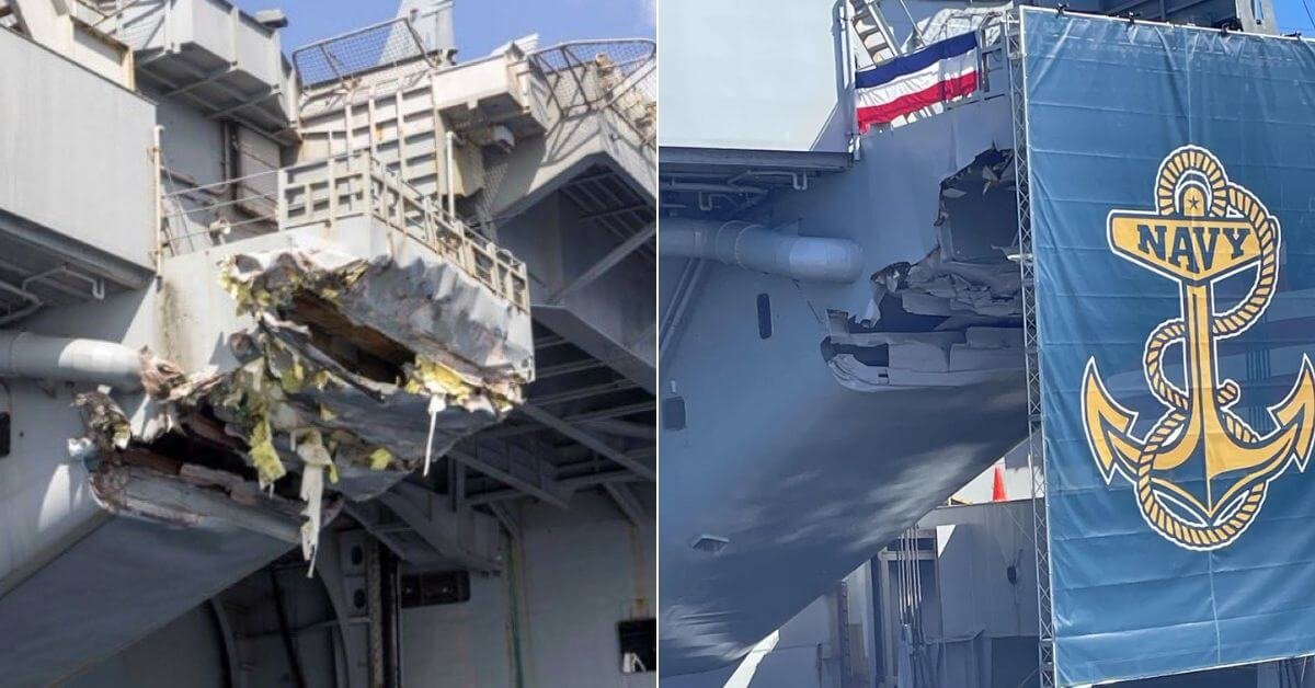 Months later, in October 2025, the starboard damage remained visible, although it had been partially concealed with haze gray paint and a large Navy banner during a public event marking the U.S. Navy’s 250th anniversary.