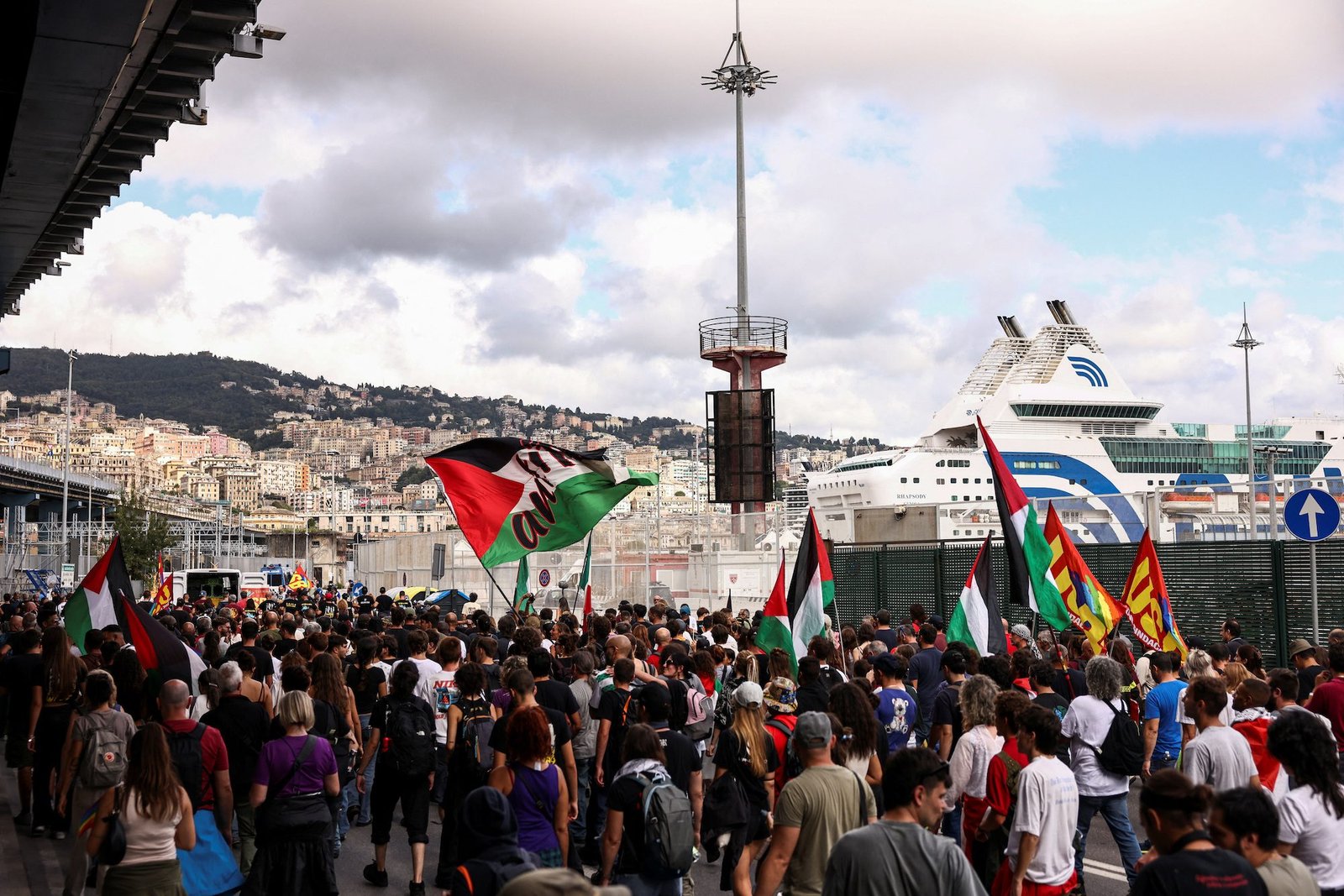 In Genoa, in northwest Italy, some protesters waved the Palestinian flag during early morning gatherings around the port. Further down the coast in the Tuscan city of Livorno, an entrance to the port was blocked by protesting workers.