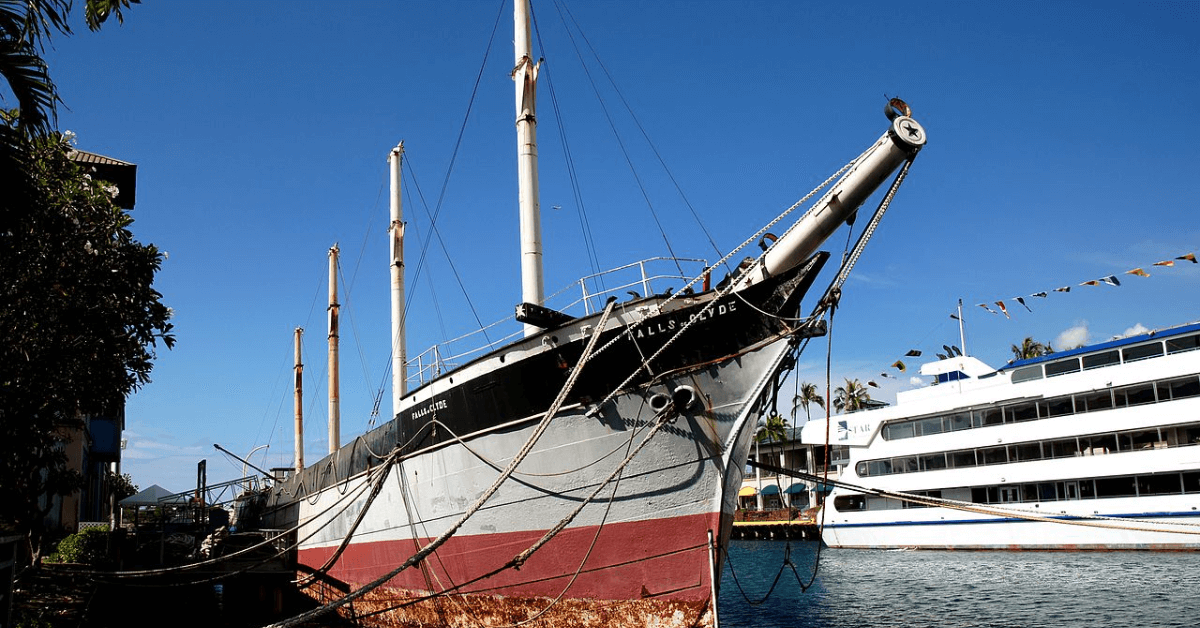 Falls of Clyde has been docked at Honolulu Harbor since 2008 and is currently berthed at Pier 7. It once served as a museum ship under the Hawai‘i Maritime Center.