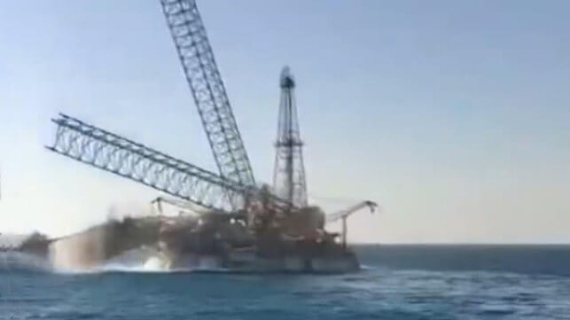 The jackup barge was being towed by an unidentified tug and was approximately 130 miles south of the entrance to the Suez Canal in the Red Sea. A video posted on social media shows the legs collapsing onto the barge. It later capsized.