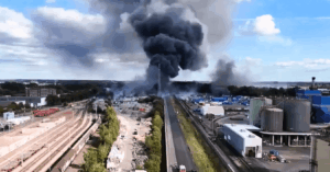 The fire began around midday in a car inside the warehouse and quickly spread to nearby halls, containers, and vehicles. The exploding cylinders sent debris flying, making it too dangerous for firefighters to approach in the early hours.