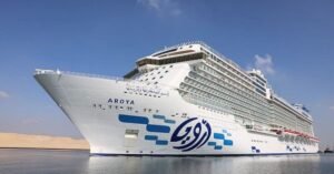 The Aroya sails under the Marshall Islands flag, measures 335 meters in length, and has a beam of 38 meters. The ship is registered at 151,000 gross tons and can carry more than 3,300 passengers along with over 1,600 crew members when fully booked.