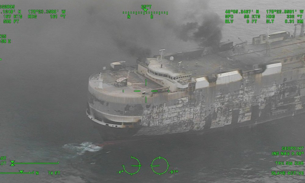 A Coast Guard C-130J Super Hercules aircraft conducted an overflight of the car carrier on Sunday and observed no signs of pollution. The vessel’s watertight integrity remains intact. However, images from the overflight show that the fire has caused considerable damage to the entire vessel.