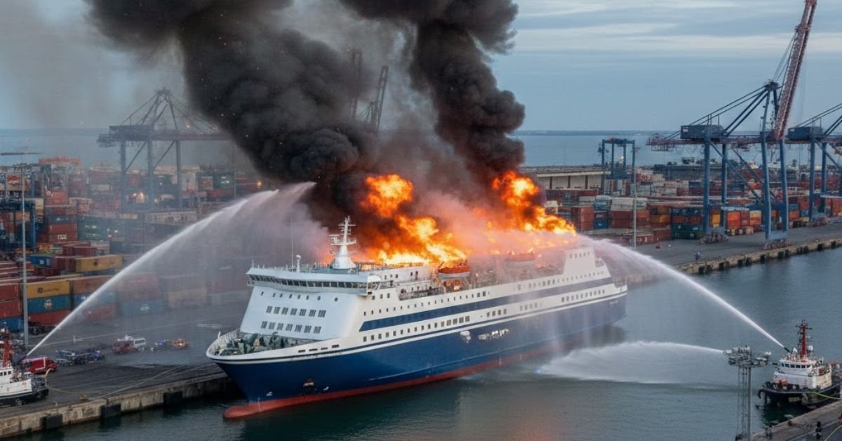Images on social media showed the 185 m-long ferry on fire. It was sailing under the flag of Panama.