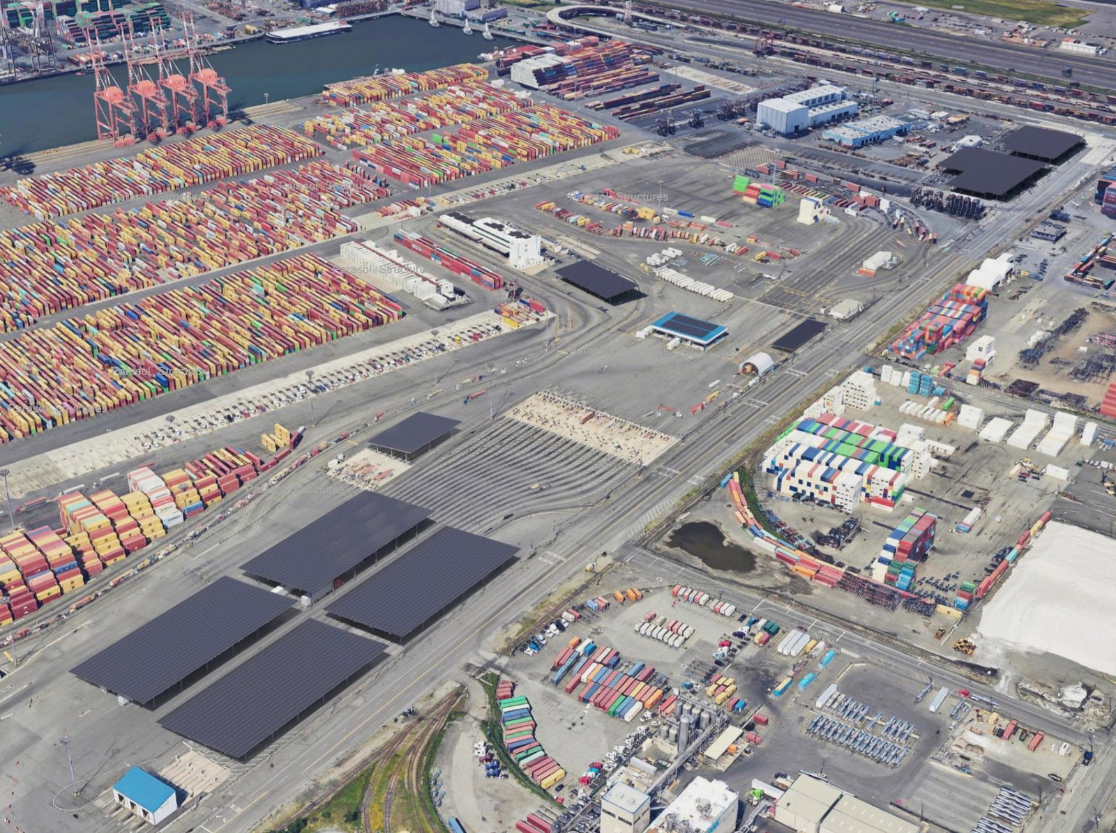 Five elevated canopy-mounted solar arrays spanning multiple truck lanes produces 3.8 megawatts, while additional canopies and rooftop arrays generate another 3.4 megawatts. The installation takes up just 0.04 acres of ground space in the port’s urban location, and will also contribute surplus electricity back to the regional power grid.