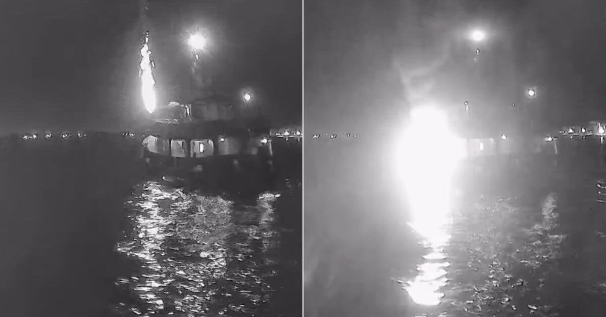 Videos posted by the GSF show a bright object hitting the vessel from above, followed by smoke and flames. One crew member reported seeing a drone hovering a few meters above the ship before it dropped an explosive device, which caused a large explosion and fire.