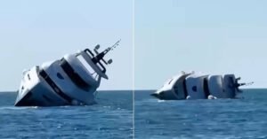 Video footage captured the moment the yacht began swaying in the water, tilting dangerously before it started taking on water. In one clip, a man dressed in a dark suit can be seen standing on the yacht’s upturned side before diving into the sea.