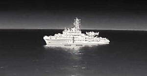 The attack targeted a multipurpose Russian vessel operating in Novorossiysk Bay, the current base for Russia’s Black Sea fleet. Video footage of the strike shows drones hitting the ship’s antennas and electronic equipment directly, leaving its electronic warfare systems destroyed and the vessel disabled.